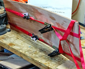 Because these plates are relatively short, getting them to conform to the previously mentioned curves is difficult due to the stiffness of the plywood. I decided to try and pre-bend them a bit using steam. I was a bit concerned about the steam heat causing the panels to delaminate, but the book I have on building plywood boats talks about using boiling water to get panels to bend when fitting them to the boat. So I figured it would be okay to try and if I didnt like the results, I could always try something else.